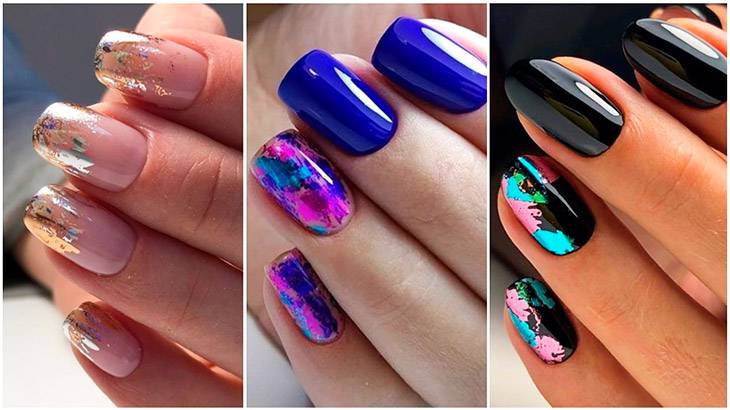 Маникюр с фольгой на коротких ногтях стал трендовым относительно недавно. Чаще всего он выглядит как покрытие с добавлением золота или серебра. Смотрится необычно и богато.