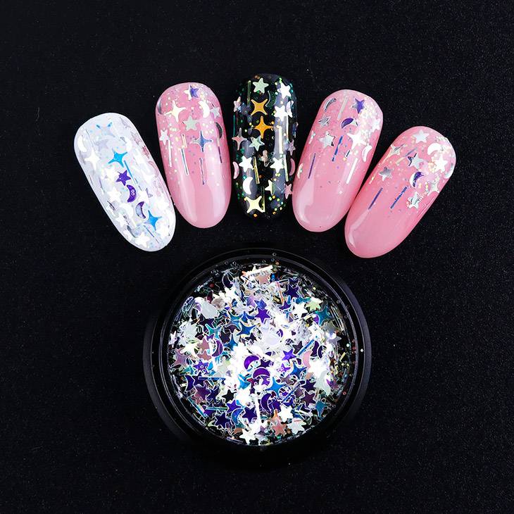 При создании блестящего дизайна используется втирка или лаки, в состав которых входят в большой концентрации светоотражающие частицы.