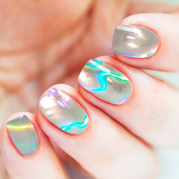Нейл-индустрия не стала ограничивать металлическим блеском даже нестандартные цвета и выпустила достаточно широкую линейку лаков, состоящую из бирюзового, фиолетового, желто-зеленого, кобальтового, винного и изумрудного. Желательно использовать их в монохроме, так как такие лаки слишком самодостаточные и не терпят рядом с собой дополнительные элементы. Единственный вид декора, который допускают дизайнеры — это эффект зеркального шара для дискотек или «битое стекло».