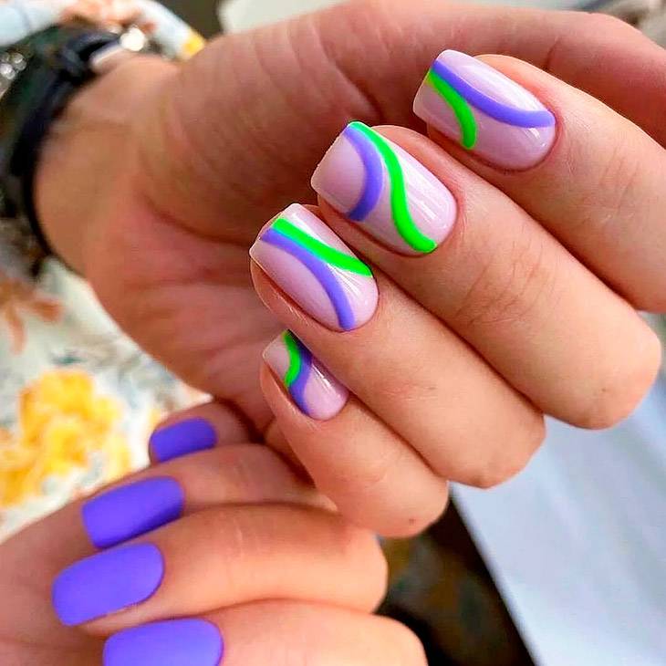 Маникюр с полосками отличается лаконичностью и простотой выполнения. Для создания линий на коротких ногтях понадобится тонкая кисть или скотч-лента.