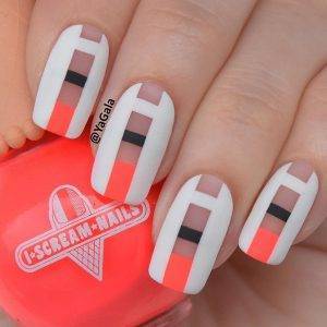 Вертикальный френч – идеальное решение для широких пластин. «Квадрат» даже короткий, «одетый в подобный френч будет выглядеть «стройнее» и «выше». Весь секрет все в той же технике окрашивания, как котуринг, но в преломлении френча.