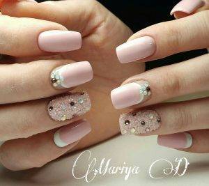- пастельные оттенки визуально сделают ногти длиннее. Это универсальная гамма, подходящая к любому стилю и сочетающаяся с другими цветами. А если его нюдовые оттенки дополнить стразами, блестками, то получится нежный романтичный дизайн, идеально подходящий для праздничных мероприятий.