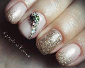 Пока золотой лак не высох, на него закрепляют разноцветные стразы. Конечный итог заставит окружающих восхищаться такой женщиной.