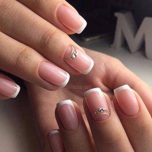 Французский маникюр не теряет своей актуальности и постоянно фигурирует в списке модных тенденций. Эта техника хорошо смотрится на разных формах ноготков, но наиболее подходящим вариантом считается квадратная ногтевая пластина. Если вы хотите визуально удлинить ноготь, французский маникюр – то, что вам нужно в такой ситуации. Для такой формы ноготков актуальным решением будет выполнение французских улыбок с декором в виде шеврона. Еще один стильный тип улыбки – треугольная форма. Выполнять такой маникюр можно как на прозрачной основе, так и на обычном покрытии любого цвета. При этом улыбка должна выделяться и гармонировать с основным тоном. По желанию можно использовать разные декоративные элементы.