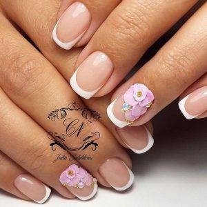 В нашем варианте френч выполнен в стандартном классическом варианте с использованием небольшого акцента в виде цветка на безымянном пальце. Смотрится такой вариант невероятно нежно и утонченно. Обладательница такого маникюра наверняка заслужит похвалы и высокой оценки внешнего вида.
