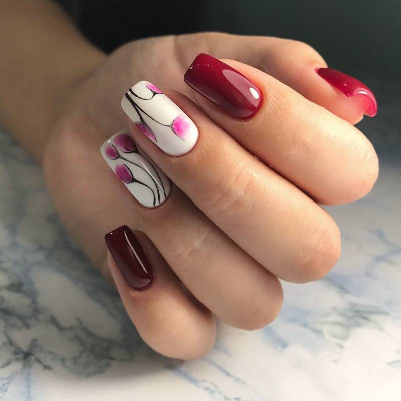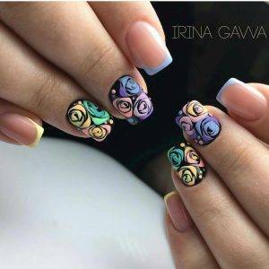 - Френч с флористическими мотивами. Этот тренд согласуется с модными расцветками одежды, особенно актуален такой нейл-арт для теплого периода года.