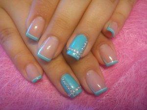 - синий цвет также находится в фаворитах среди обладательниц короткой длины ногтей. Стильно и элегантно смотрится его сочетание с черным; с белым цветом можно создать модный дизайн в технике гжель. Сказочно смотрится на синем фоне россыпь серебристых блесток и страз.