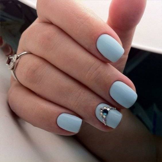 Мягкий голубой лак украсит ноготки, а если добавить тонкие золотые или серебряные полоски – можно отправляться в свет без колец на пальцах.