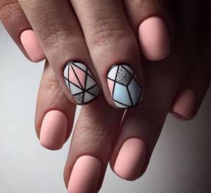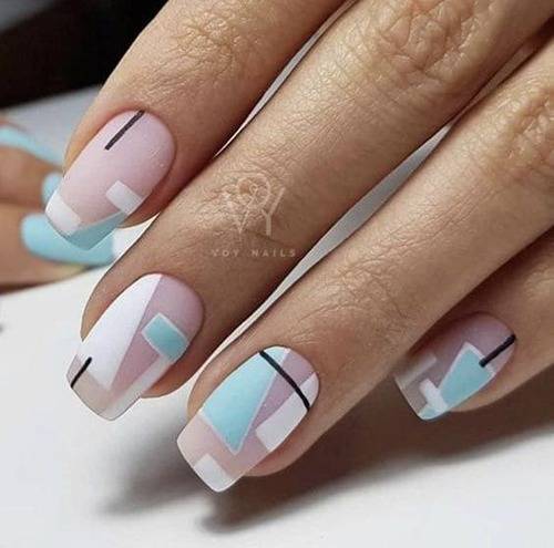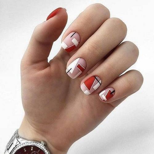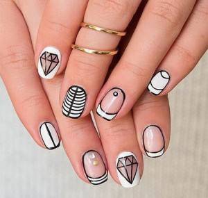 геометрия. Этот вариант дизайна давно и прочно вошел в моду. Но для короткой длины он имеет свои особенности. Откажитесь от горизонтальных полос, отдав предпочтение вертикальным. Они визуально вытянут пластину и сделают пальцы более изящными