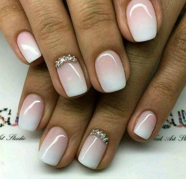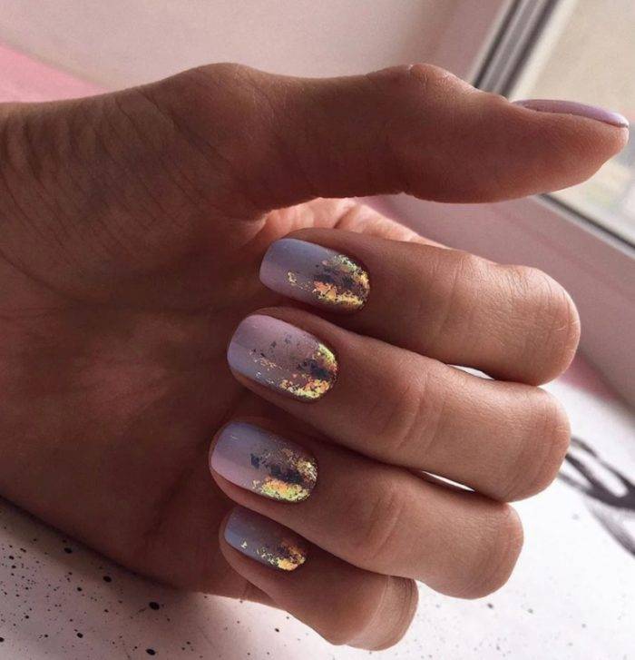 Особой нежностью на руках обладает эффект градиента. В основном используют светлые оттенки. Аккуратно исполненная растяжка добавляет рукам настоящую утонченность. Этот вариант отлично дополняют тонкими веточками, цветами, фольгой или блеском.