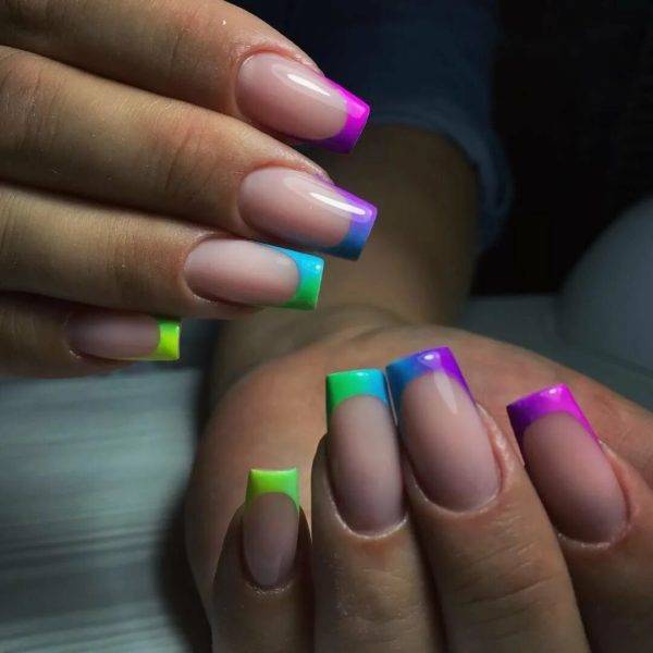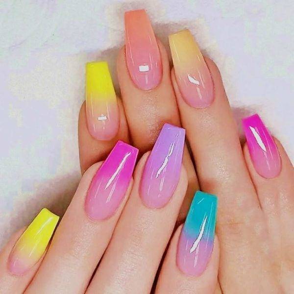В предстоящих сезонах разноцветные гель-лаки стилисты советуют использовать в маникюре на квадрантной ногтевой пластине. Такая форма позволяет экспериментировать с цветами без удешевления образа. На квадрате яркие и кислотные оттенки выглядят стильно и современно.