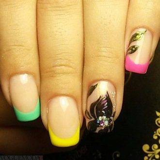 Яркий френч в этом сезоне, несмотря на отступление от классических канонов, сохранил свое главное преимущество – универсальность. Он подходит абсолютно к любому гардеробу за счет наличия нескольких цветов и эффекту слияния красок. Так или иначе, какие бы ни были оттенки в вашем образе, но один из цветов маникюра френч, если и не будет повторять их полностью, то уж точно создаст гармоничное сочетание.