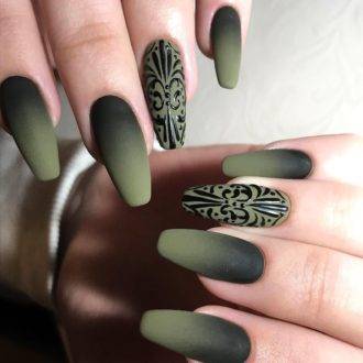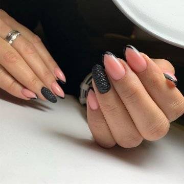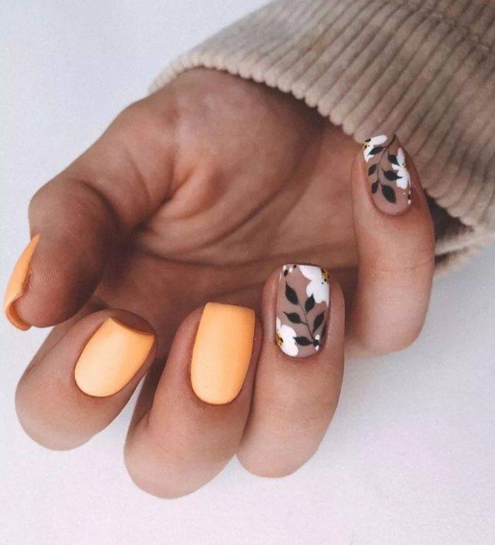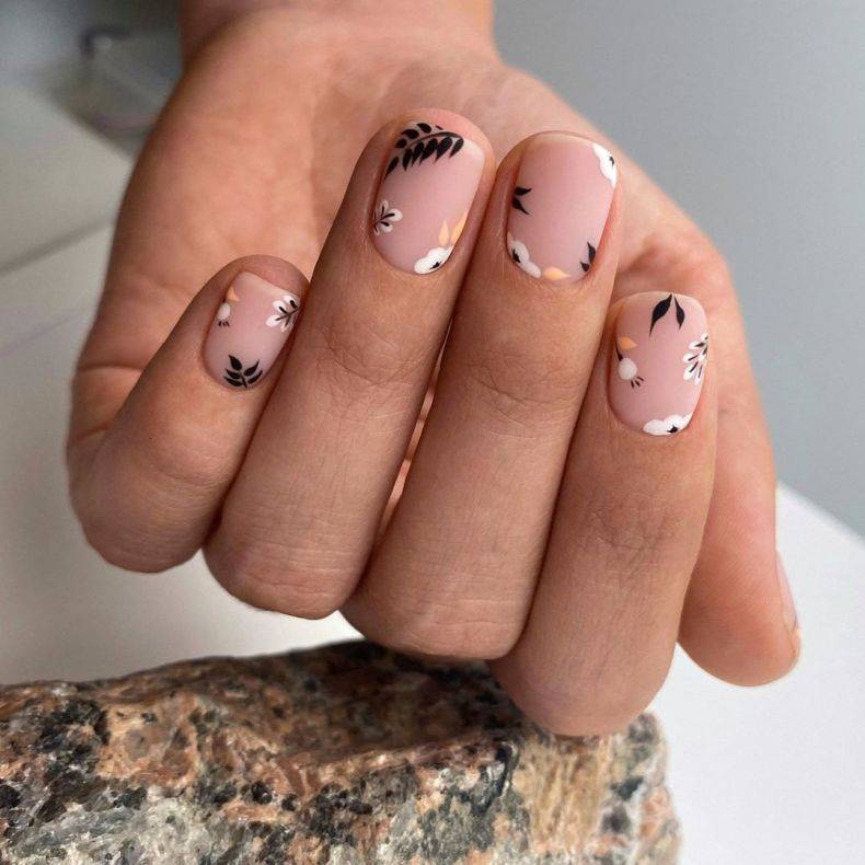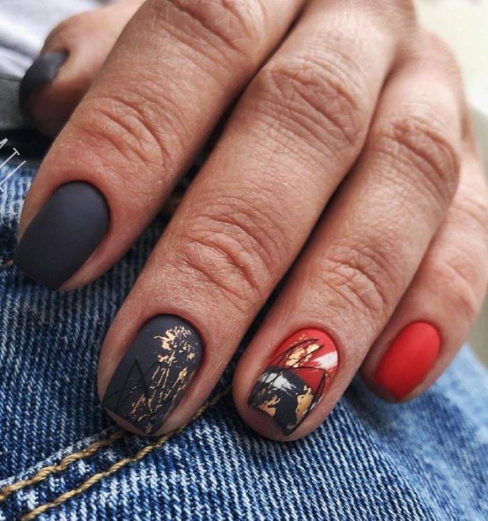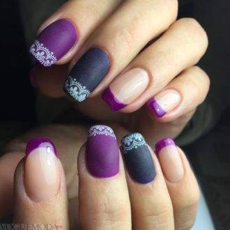 Среди модных трендов — микс матового и глянцевого маникюра. Игра текстур в сочетании с декорами дает потрясающий эффект. Красиво смотрится бархатный нейл-арт в виде френча, французского, лунного маникюра. На матовый фон хорошо смотрятся флористические рисунки, стразы, лепка.