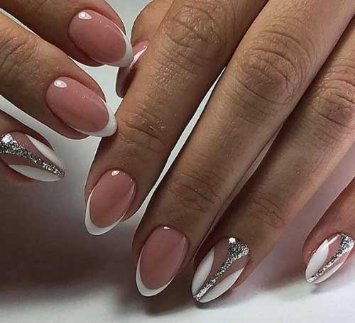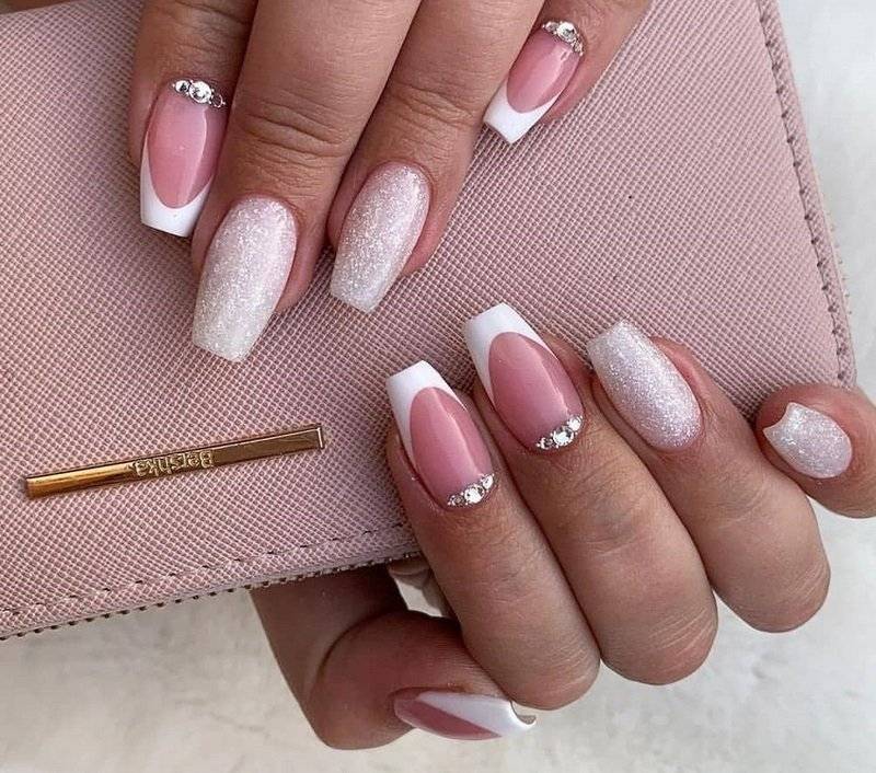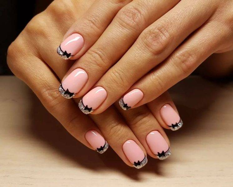 - френч с блестками — сияющие частицы можно заложить в основу или в финишное покрытие.