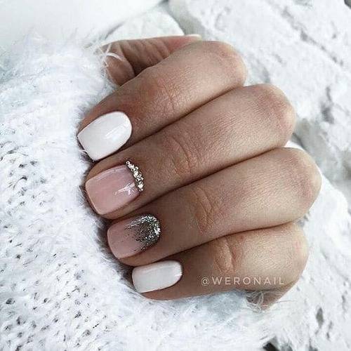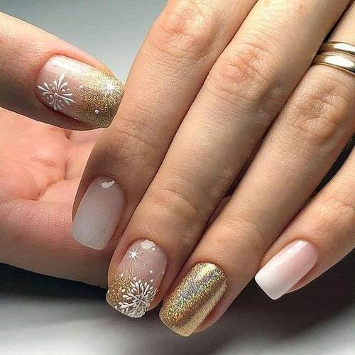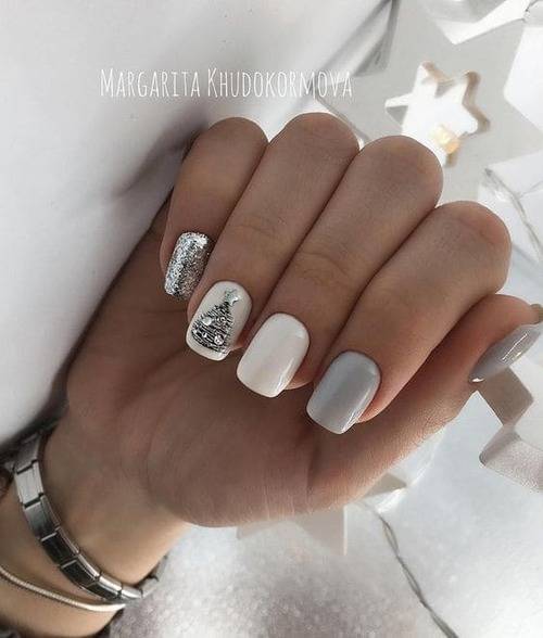 Не стоит думать, что новогодний маникюр предполагает обилие блеска, расписных картин и буйство красок. Этот дизайн можно вполне выполнить на небольшую длину пластины и в светлых тонах. Чтобы ногти не были скучны, его дополняют росписью, добавляют блеск или стразы, все по желанию клиента.