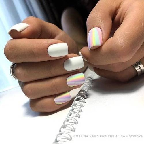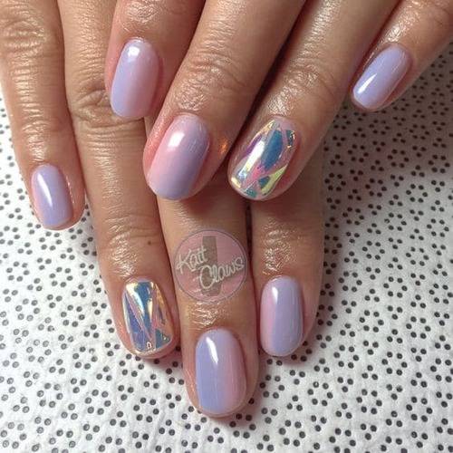 В пастельном используются сиреневые, розовые, мятные тона, голографические или жемчужные покрытия. Сверху обязательно наносится светящиеся покрытие, жемчужная втирка, выглядит нежно, в том числе и как свадебный вариант.