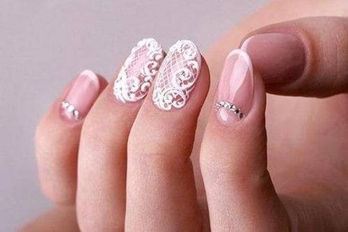 Кружевной эффект еще недавно делали исключительно для праздничного дизайна на большую длину. Особенно это было актуально для невест. Сегодня же, кружево отлично используют для создания нежного дизайна на короткие ногти светлых тонов. При этом именно такой вариант может подходить для торжества и повседневной носки.