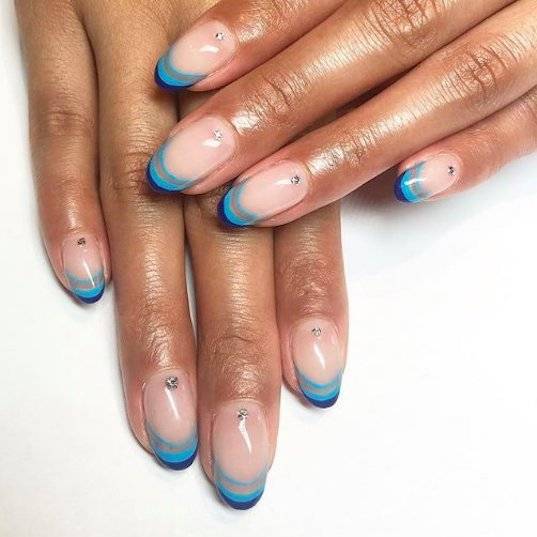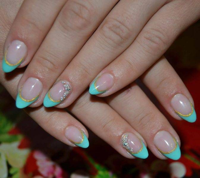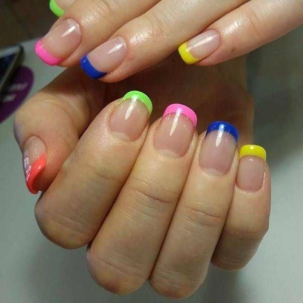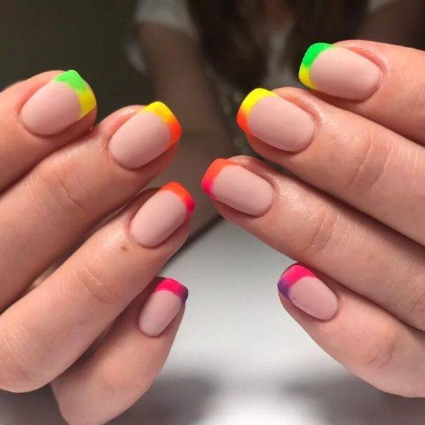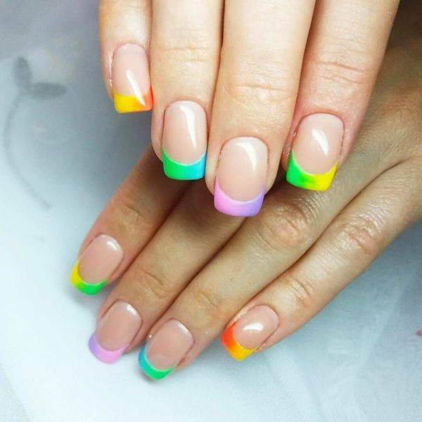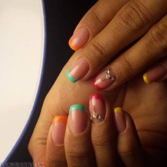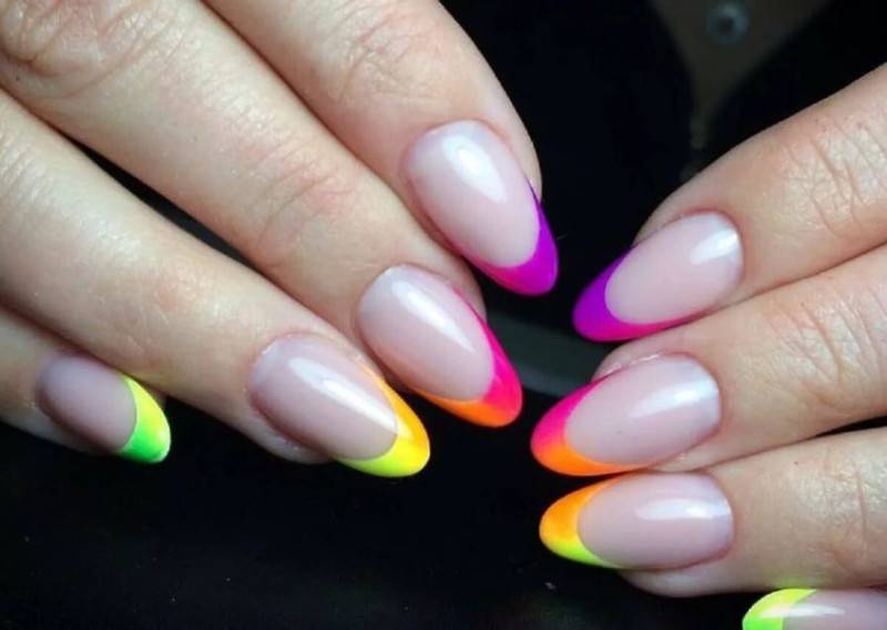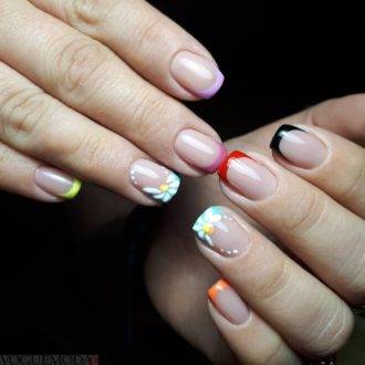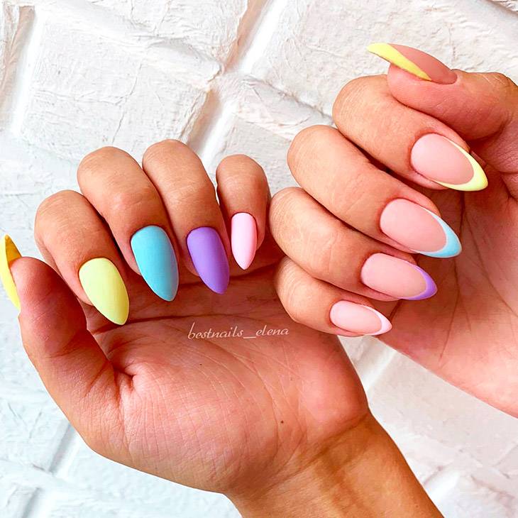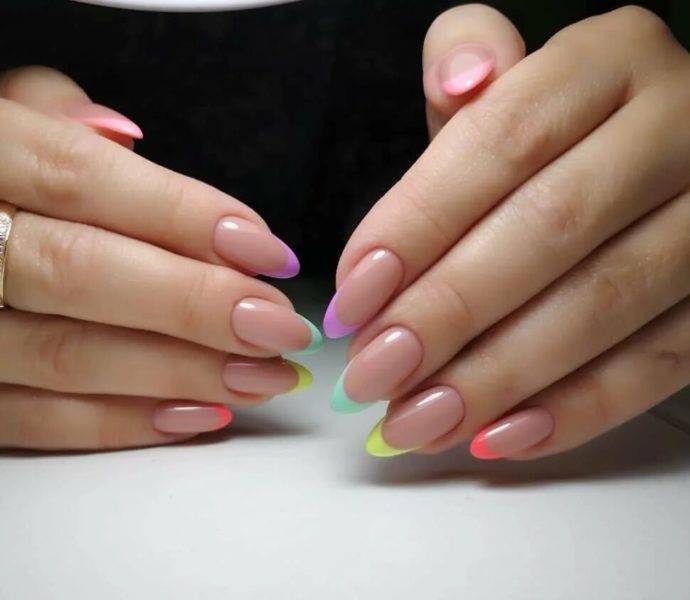 Разноцветный френч на коротком миндале может выглядеть нелепо и вульгарно. В предстоящих сезонах на такой форме не следует делать маникюр с использованием более 3 оттенков гель-лака.