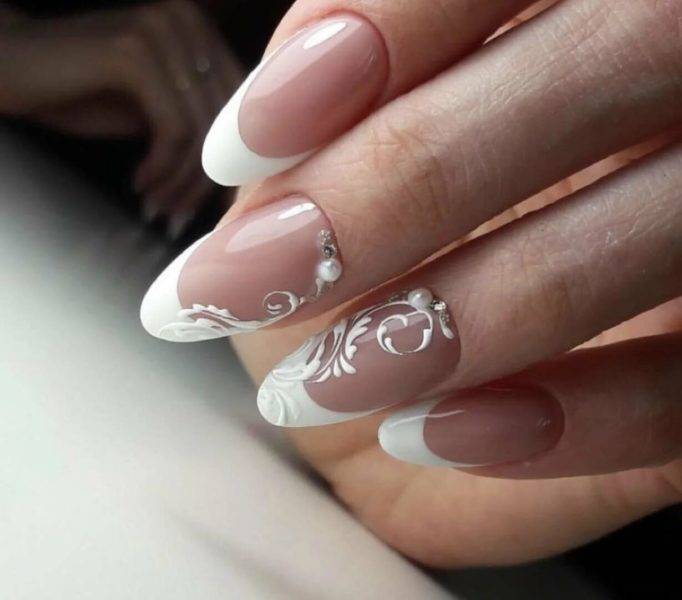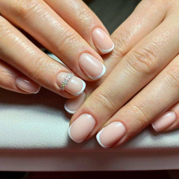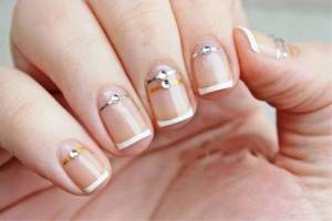 - французский маникюр — неширокая белая полоска по краю ногтя;