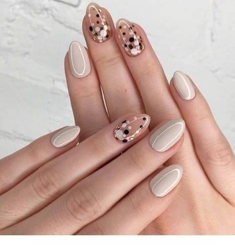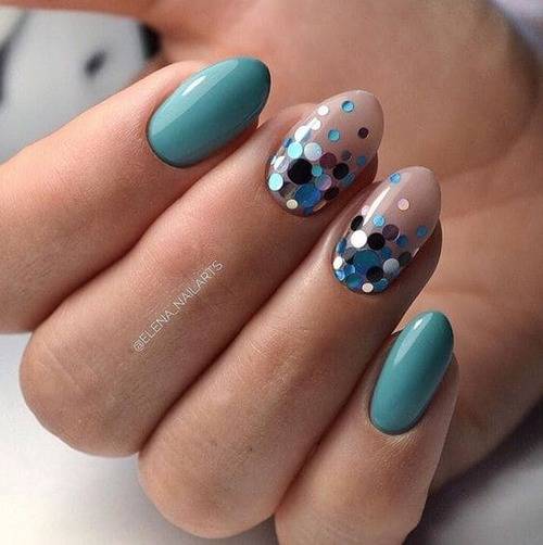 Этот вариант создают с помощью круглых плоских чешуек. Их располагают по всей длине ногтевой пластины или выборочно. Нередко этот материал сравнивают с паетками или конфетти, а ведь они действительно очень похожи, особенно на фото.