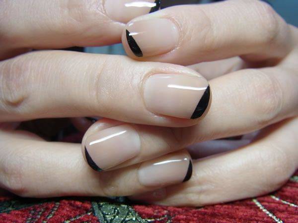 - треугольный френч — вариант маникюра, при котором линия френча образует угол параллельно острию ногтя;