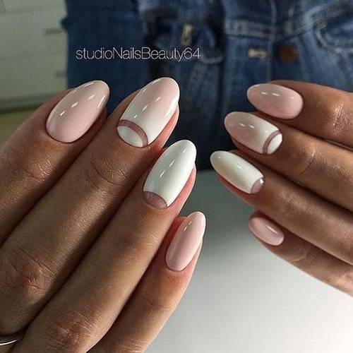 В них почти не чувствуется контраста и используются мягкие цвета. Ногтевая пластина прокрашивается основой розового, бежевого тона. Лунка может быть как чёткой, так и размытой, но не сильно выделяется на основном цвете. Светлый считается универсальным для учёбы, работы, нежных оттенков в одежде, особенно летом.