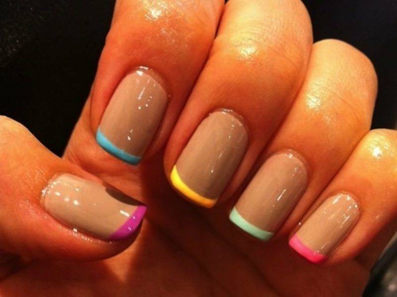 Разноцветный френч на коротком миндале может выглядеть нелепо и вульгарно. В предстоящих сезонах на такой форме не следует делать маникюр с использованием более 3 оттенков гель-лака.