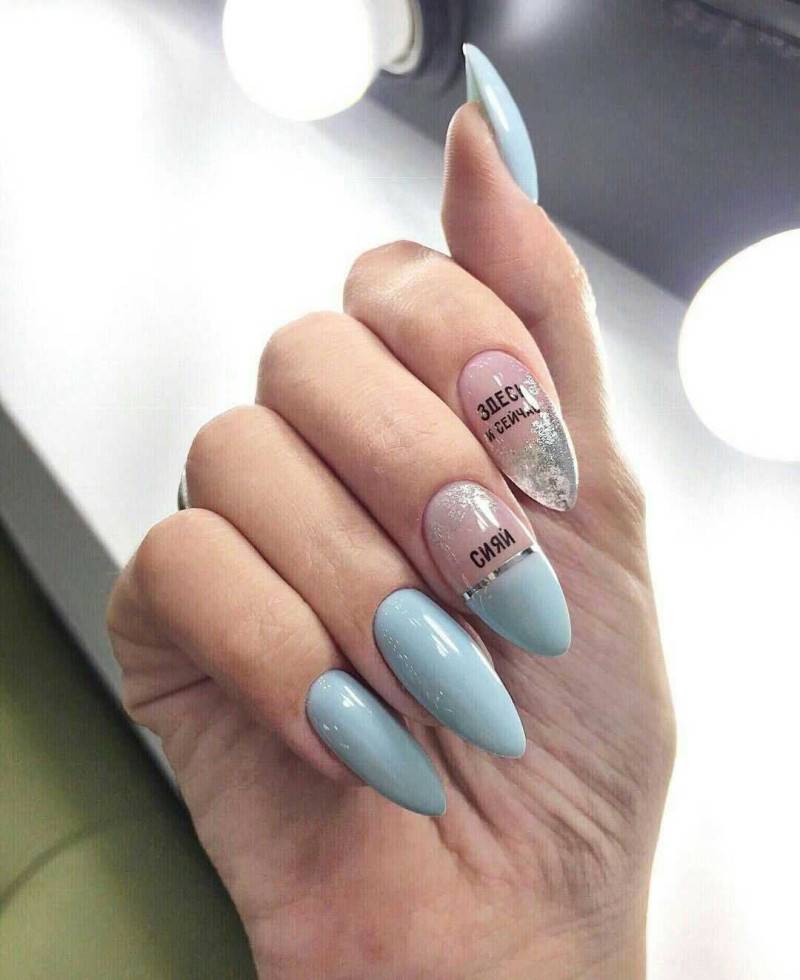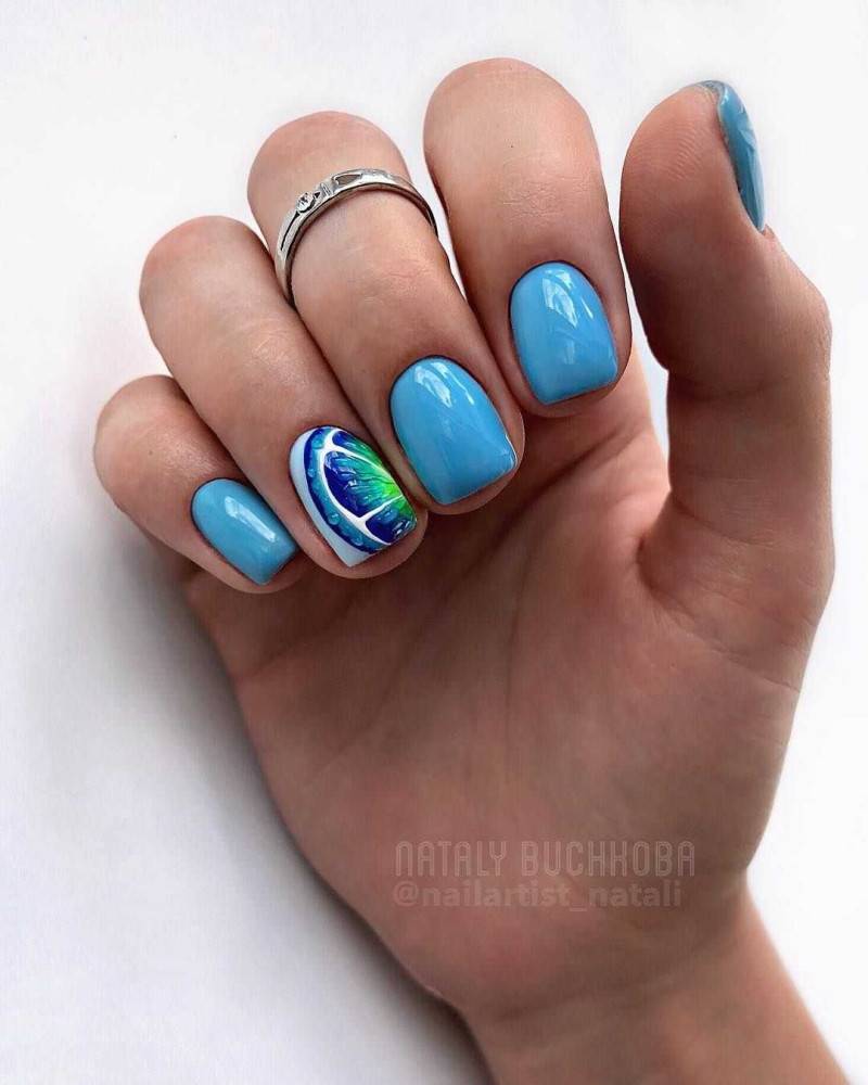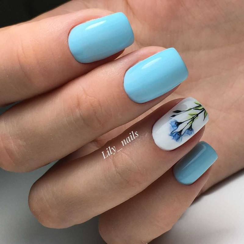 Голубое небо, морская вода, незабудки в поле – столько ассоциаций у нас связано с этим замечательным цветом. Поэтому, если вы никогда не делали голубой маникюр, то непременно восполните этот непростительный пробел. С этим цветом вы можете создать любой дизайн, воплотить в жизнь свои самые смелые идеи.