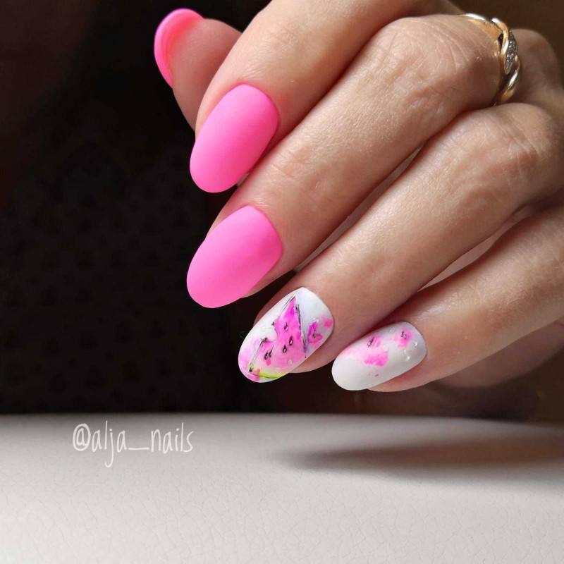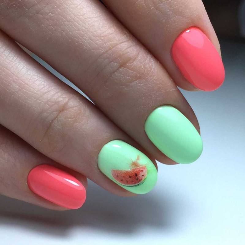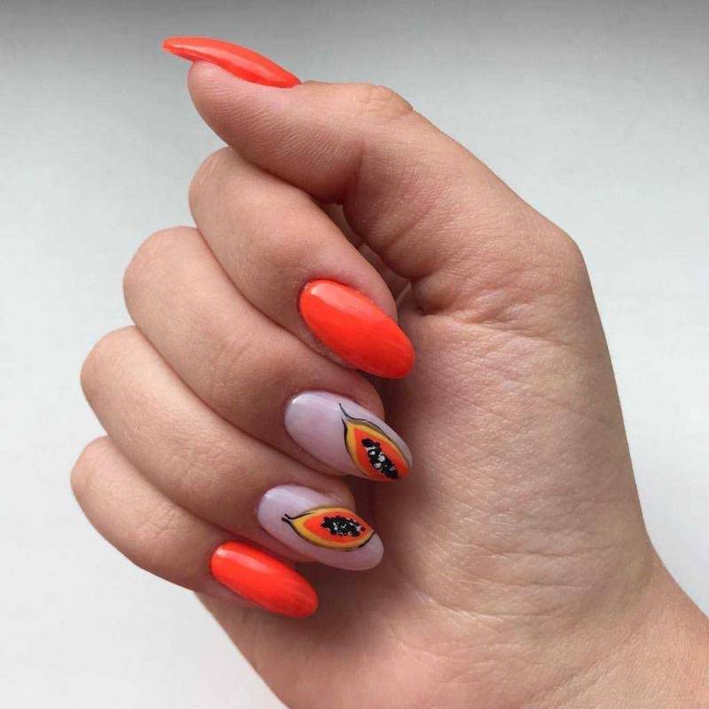 Маникюр с фруктами изменился по сравнению с нейл-артами предыдущего летнего периода. Сегодня дизайн с фруктами – это узоры на 1-2 акцентных ноготках, остальные ноготки чаще всего покрывает однотонным гель-лаком.
