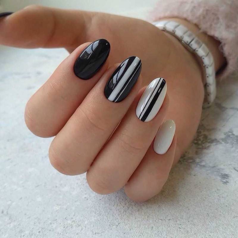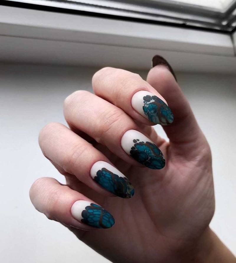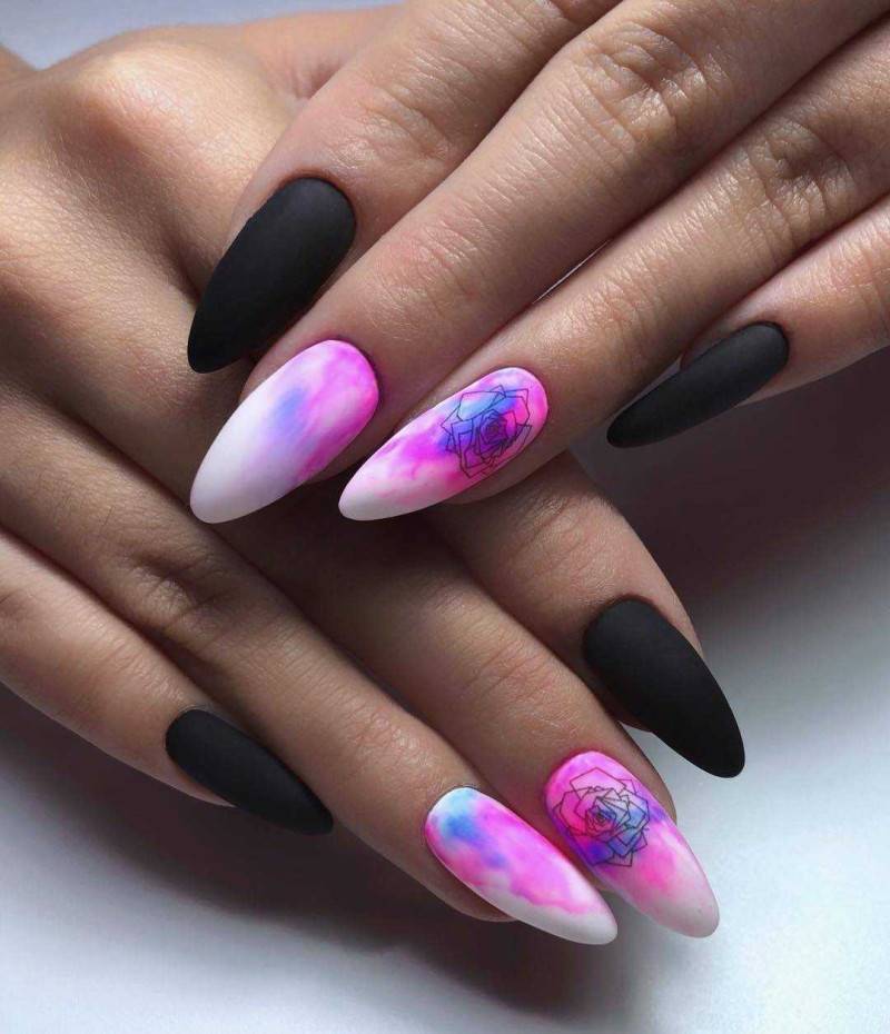Если вы ищете идеальный нейл-арт для следующего маникюра, то акварельный эффект – это то, что вам нужно. Дизайн имитирует смешение и высыхание краски на холсте; сочетание этого и ярких цветов делает его женственным и забавным вариантом. Чтобы создать такой дизайн простым способом, вы можете выбрать наклейки для ногтей, но если вы одна из тех женщин, которые предпочитают экспериментировать со своими любимыми лаками, выберите базовое покрытие и дайте ему высохнуть. Затем добавьте слой белого лака, и когда он высохнет, вы можете использовать кисть для нанесения выбранных оттенков. Нанесите несколько капель каждого цвета на кусок фольги и нанесите кистью. После каждого оттенка окунайте кисть в ацетон, а затем в желаемый лак и повторяйте процесс с другим цветом.