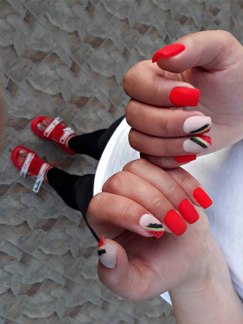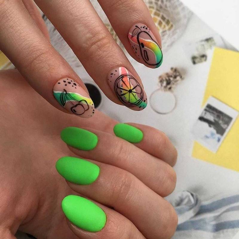 В приоритете маникюр с фруктами, созданный с помощью ручной росписи. Такой дизайн смотрится дорого и благородно. В качестве альтернативы росписи можно использовать слайдеры или стемпинг. В этих техниках также получаются стильные нейл-арты, которые порой не уступают даже профессиональным нейл-артам с росписью.