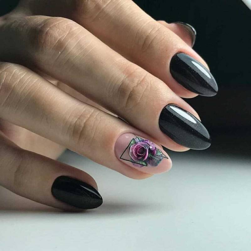 Что касается темных оттенков, то тут стоит быть осторожнее. Не рекомендуется покрывать однотонным черным гель-лаком длинные ногти стилеты, квадратные ногти. Если вы все же решили использовать темный оттенок в качестве основного, то дополняйте его геометрическим декором, серебряным глиттером, слайдерами.