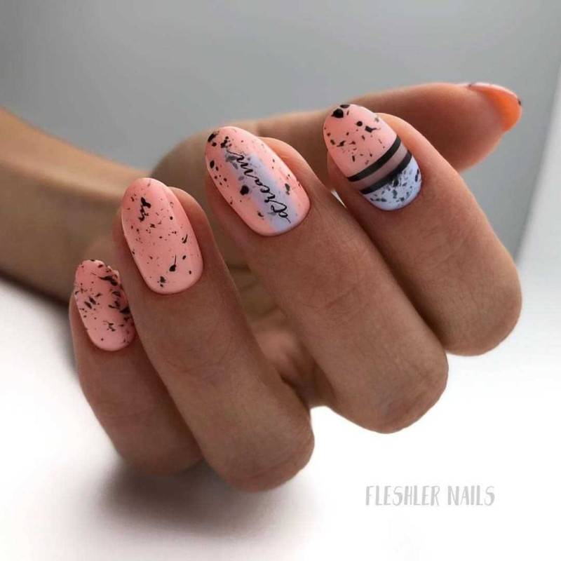 Также допускается рандомные нанесения цветов, но только строго в двух видах. Это может любой цвет на выбор, где оттенки хорошо гармонируют друг с другом, либо наоборот, конфликтуют. В таком случае маникюр получится очень креативным, ярким и броским.