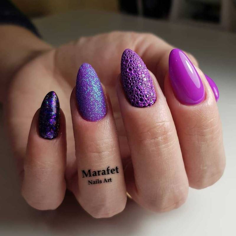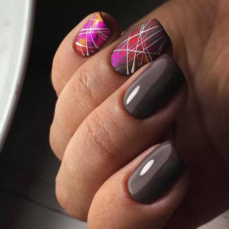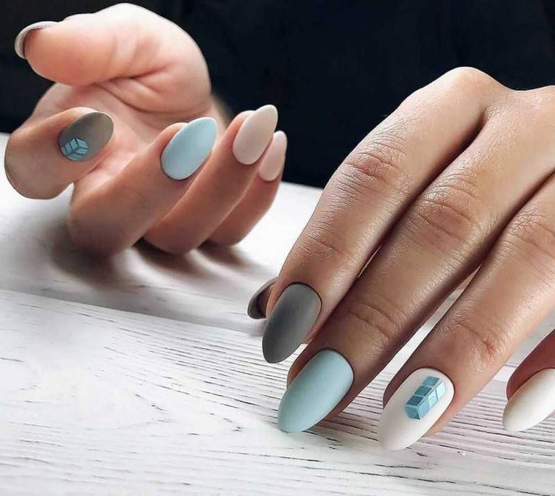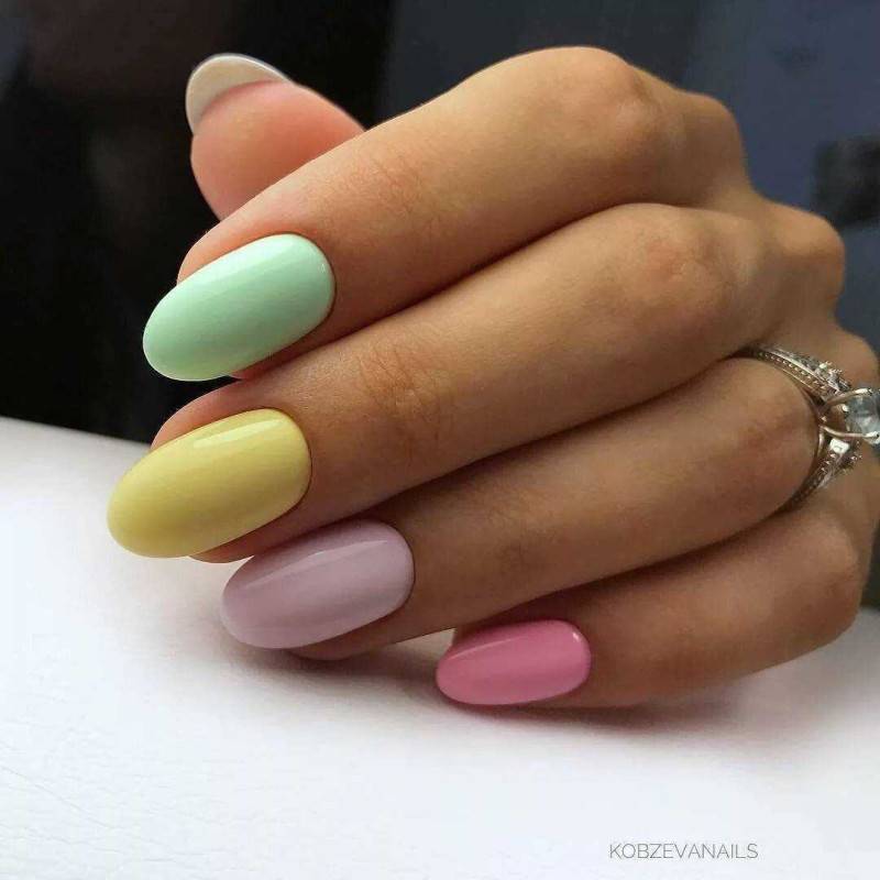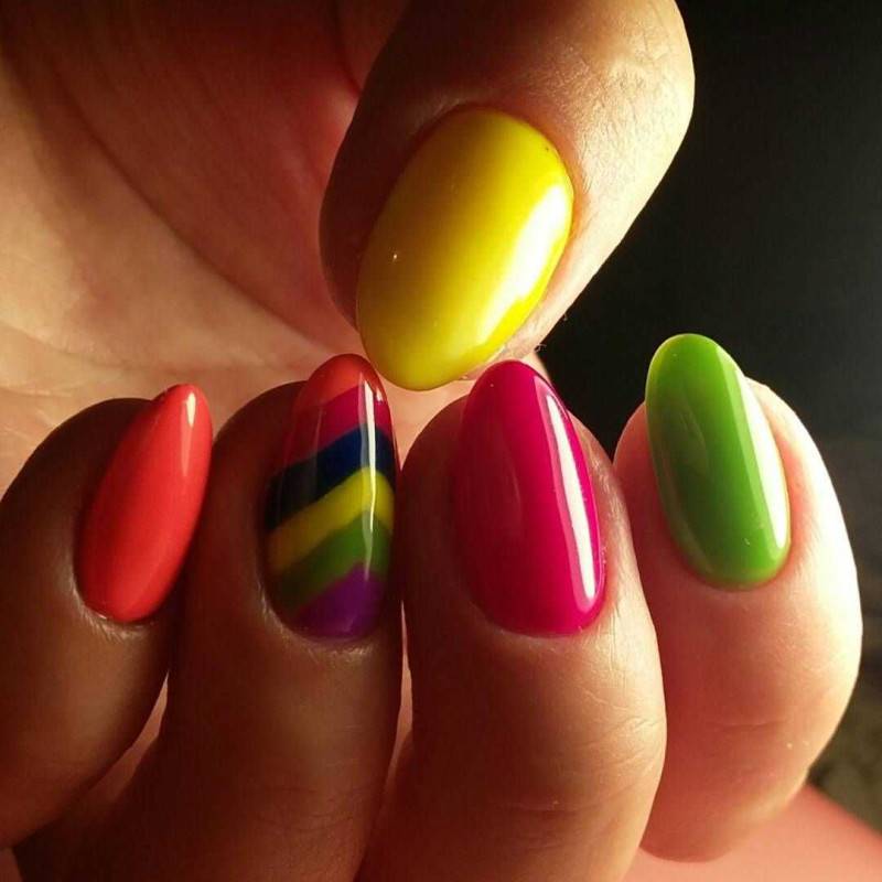 Этот тип маникюра идеально смотрится на ногтях одинаковой формы и длины. Можно все ногти одной руки накрасить разным лаком, но цвета должны сочетаться.
