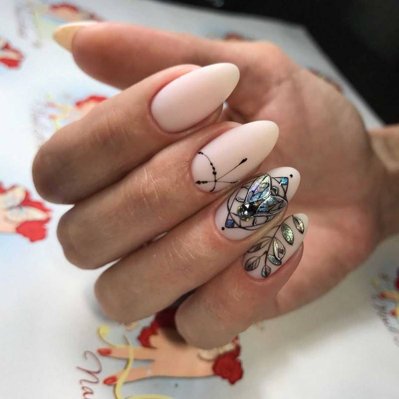 Безусловный лидер сезона – матовый топ. Этот дизайн всегда смотрится элегантно и дорого. Взрослые дамы и младшее поколение уже давно оценили все преимущества бархатистых оттенков. Он идеально смотрится на любой длине ногтей. Актуально будет добавить элементы декора, но их не должно быть много. Украшения в большом количестве на ногтях смотрятся вульгарно и несуразно.