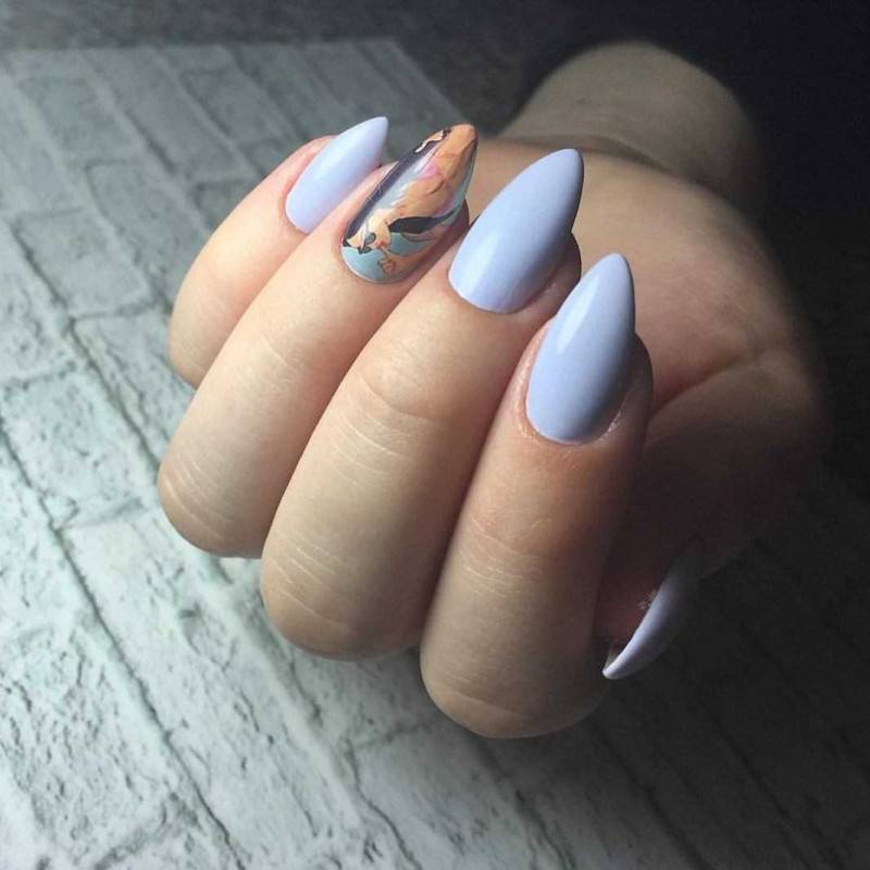 Средняя форма позволяет подобрать к ним красивый, а порой и удивительный дизайн. В частности, летним вариантом станут мазки кисти и двойная расцветка. Кстати, в последнем варианте двойной цвет лака может наноситься на один ноготь пополам, а в другом использоваться на одной руке один, на второй – другой.