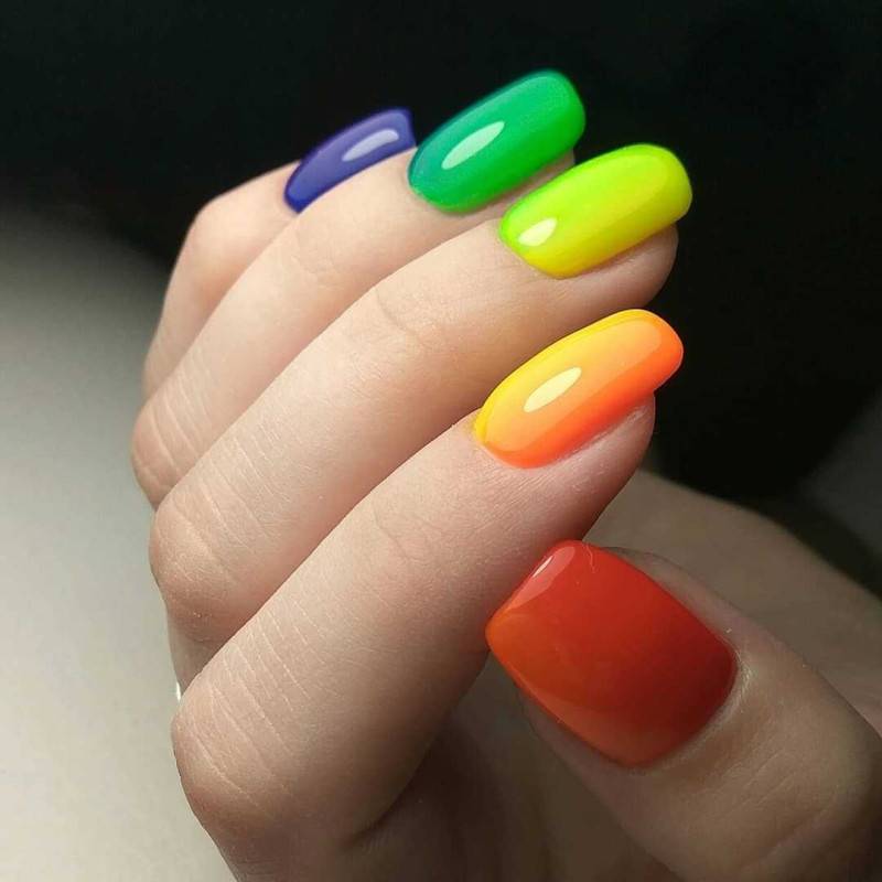 Маникюр радуга может исполнятся по-разному. В одном варианте — это радужный лак по всем ноготкам, где каждый цвет отличается друг от друга на один-два тона. В другом — это обмре или градиент.