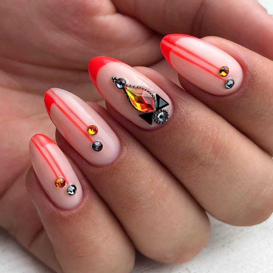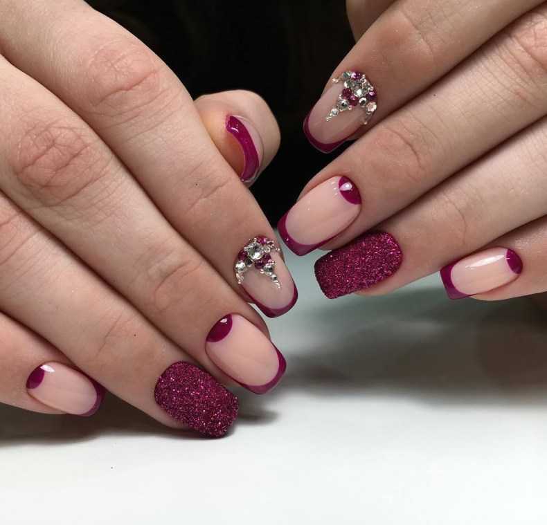 Модные тенденции маникюра френч — разноцветные кончики на ногтях вкупе с хрустальной крошкой.