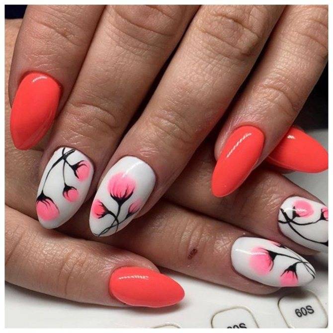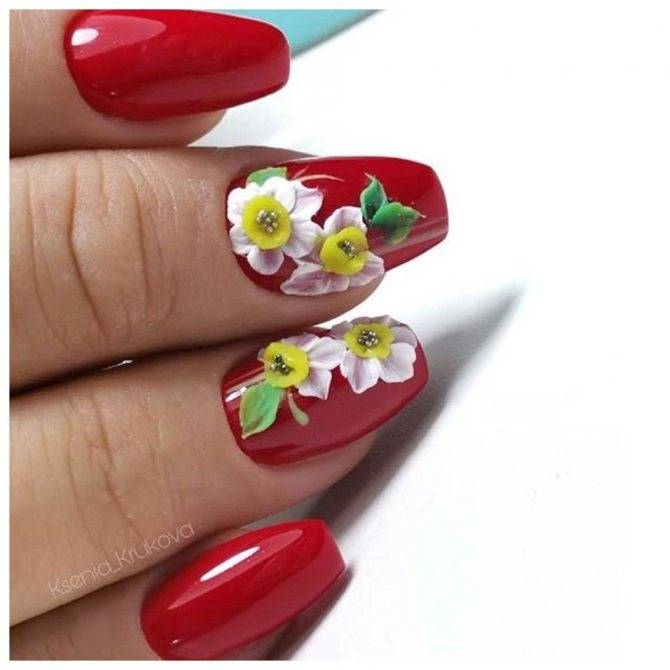 Чтобы ногти с цветами выглядели современно, а не аляповато, следует наносить рисунки по фен-шуй, а не на все ногти сразу, если это не мелкие цветочки в виде ромашек или маков. Розы, тюльпаны, ирисы рисуют на безымянном пальце или среднем.