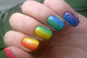 Маникюр радуга может исполнятся по-разному. В одном варианте — это радужный лак по всем ноготкам, где каждый цвет отличается друг от друга на один-два тона. В другом — это обмре или градиент.
