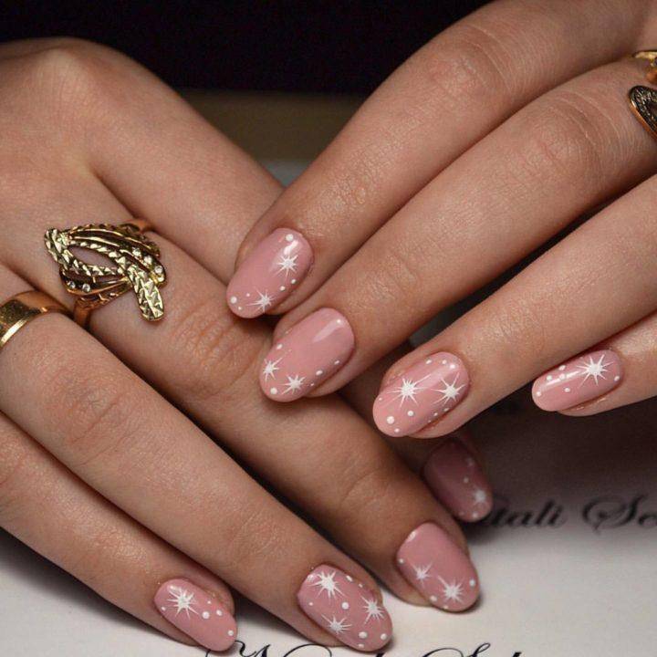 В качестве весеннего маникюра можно использовать также пастельный розовый или персиковый гель как основу. На нем белым лаком рисуют мелкие цветы, можно использовать стразы, но не слишком объемные.