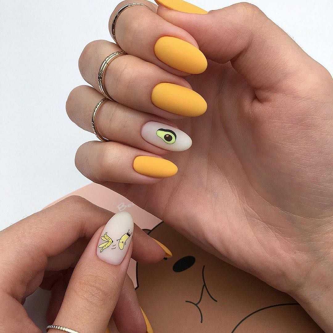 В приоритете маникюр с фруктами, созданный с помощью ручной росписи. Такой дизайн смотрится дорого и благородно. В качестве альтернативы росписи можно использовать слайдеры или стемпинг. В этих техниках также получаются стильные нейл-арты, которые порой не уступают даже профессиональным нейл-артам с росписью.