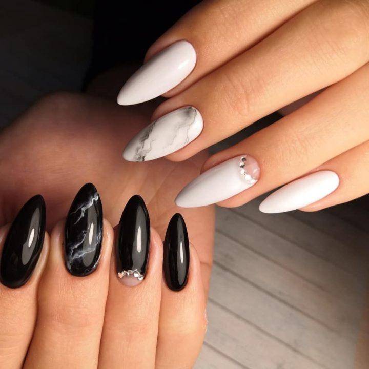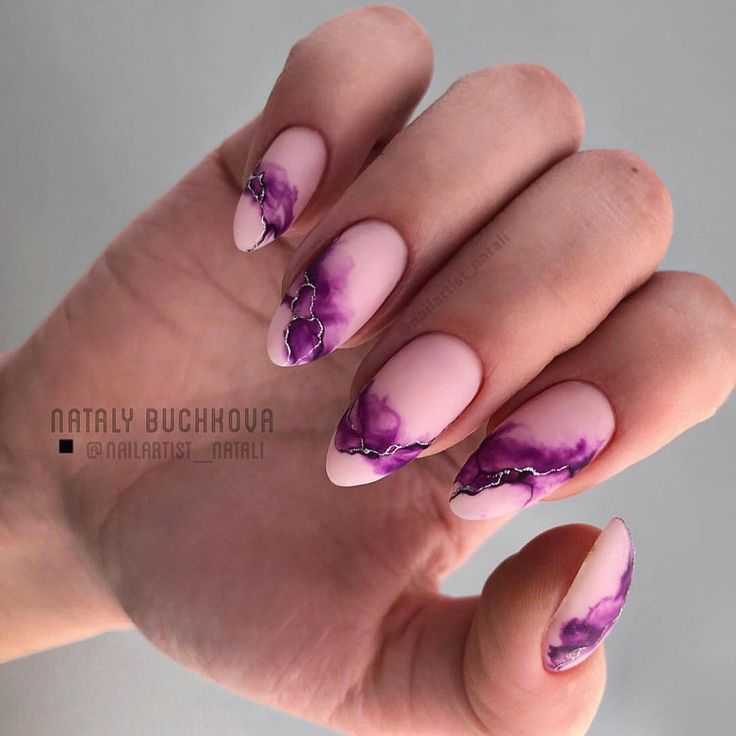 Креативно и эффектно будет смотреться мрамор на ноготках. Замысловатые узоры и красивые переливы оттенков способны унести в страну волшебных грез. Основу обычно украшают различным декором. Это могут быть полоски золотой или серебряной фольги, поталь, стразы или тонкие линии из мелких блесток.