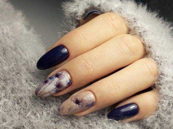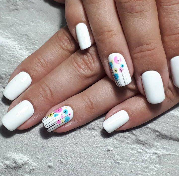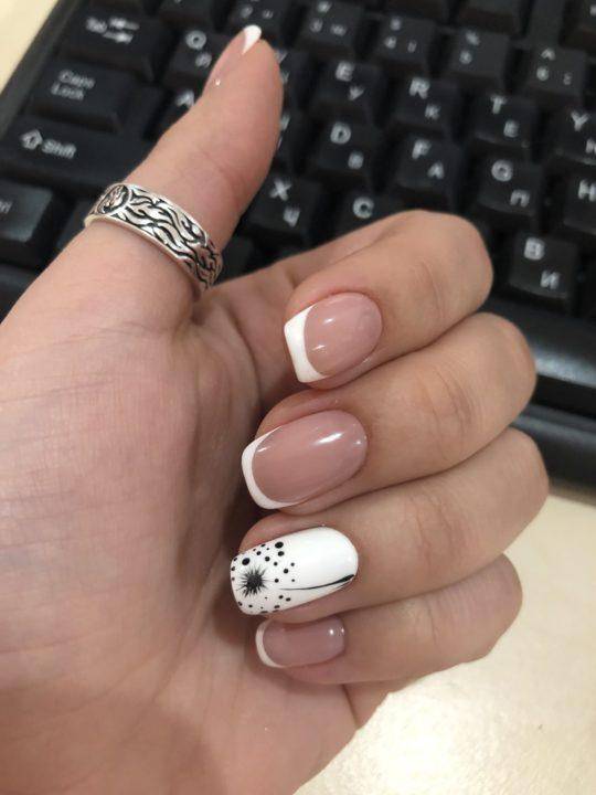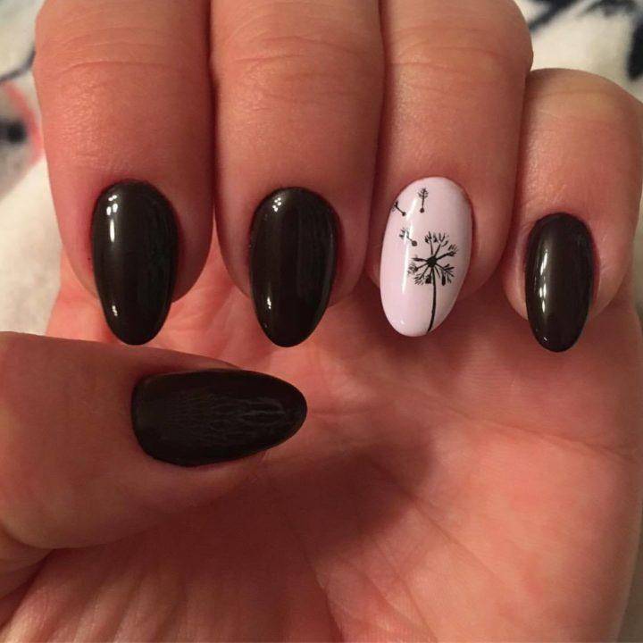 Особенно летом 2021 будут ценится простые одуванчики. Они выполняются в едином или множественном числе, где каждый цветок сможет украшать свою часть ноготка. Больше всего пользуется популярностью черно-белый рисунок на пастельном тоне.