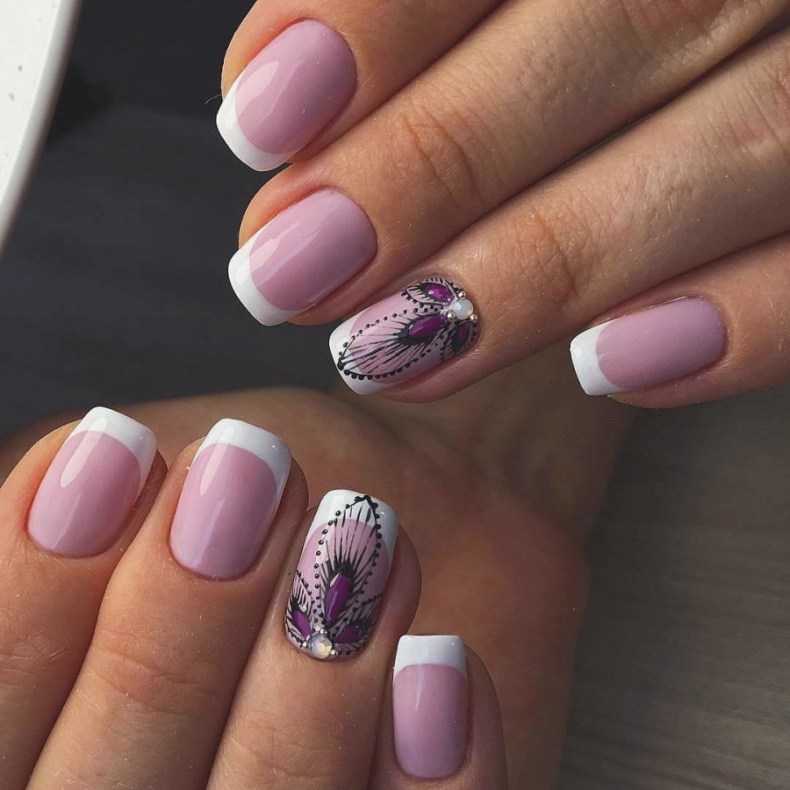 Большинство современных стилистов в летнее время всем романтическим натурам настоятельно рекомендуют отдать свое предпочтение в пользу традиционного френча. Вот только в этом случае не нужно оставлять ногтевую пластину полностью чистой. Достаточно выбрать один или пару ноготков и изобразить на них красивые растительные элементы: цветочки, насекомых, лепестки, листики. К примеру, на ногтях могут во всей красе расцвети ромашки, маки, фиалки, а рядом с ними смело можно изобразить яркую порхающую бабочку, либо божью коровку.