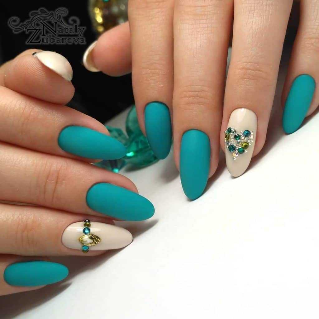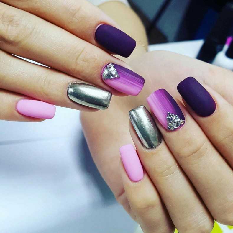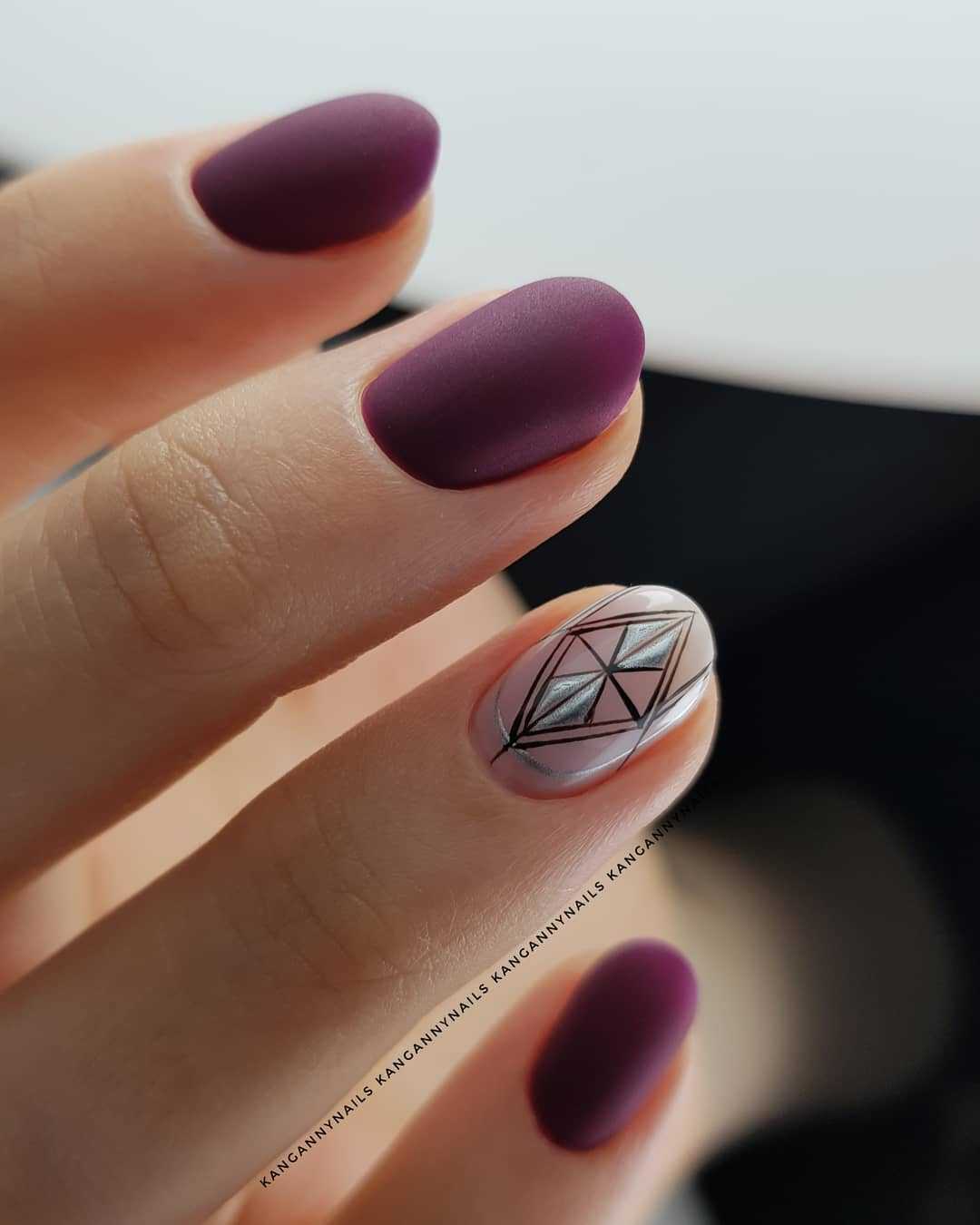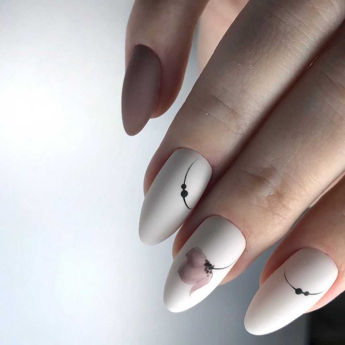 Безусловный лидер сезона – матовый топ. Этот дизайн всегда смотрится элегантно и дорого. Взрослые дамы и младшее поколение уже давно оценили все преимущества бархатистых оттенков. Он идеально смотрится на любой длине ногтей. Актуально будет добавить элементы декора, но их не должно быть много. Украшения в большом количестве на ногтях смотрятся вульгарно и несуразно.