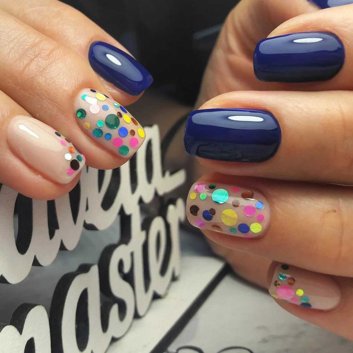 Также допускается рандомные нанесения цветов, но только строго в двух видах. Это может любой цвет на выбор, где оттенки хорошо гармонируют друг с другом, либо наоборот, конфликтуют. В таком случае маникюр получится очень креативным, ярким и броским.