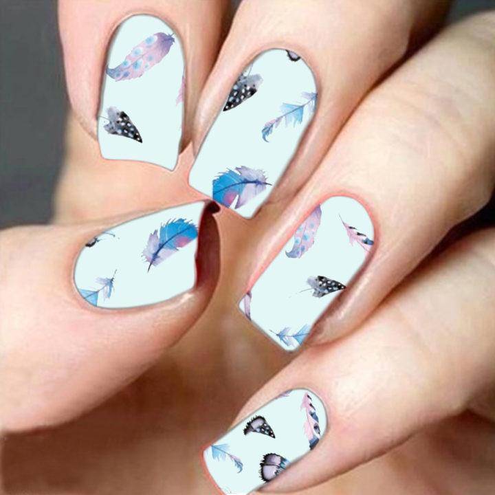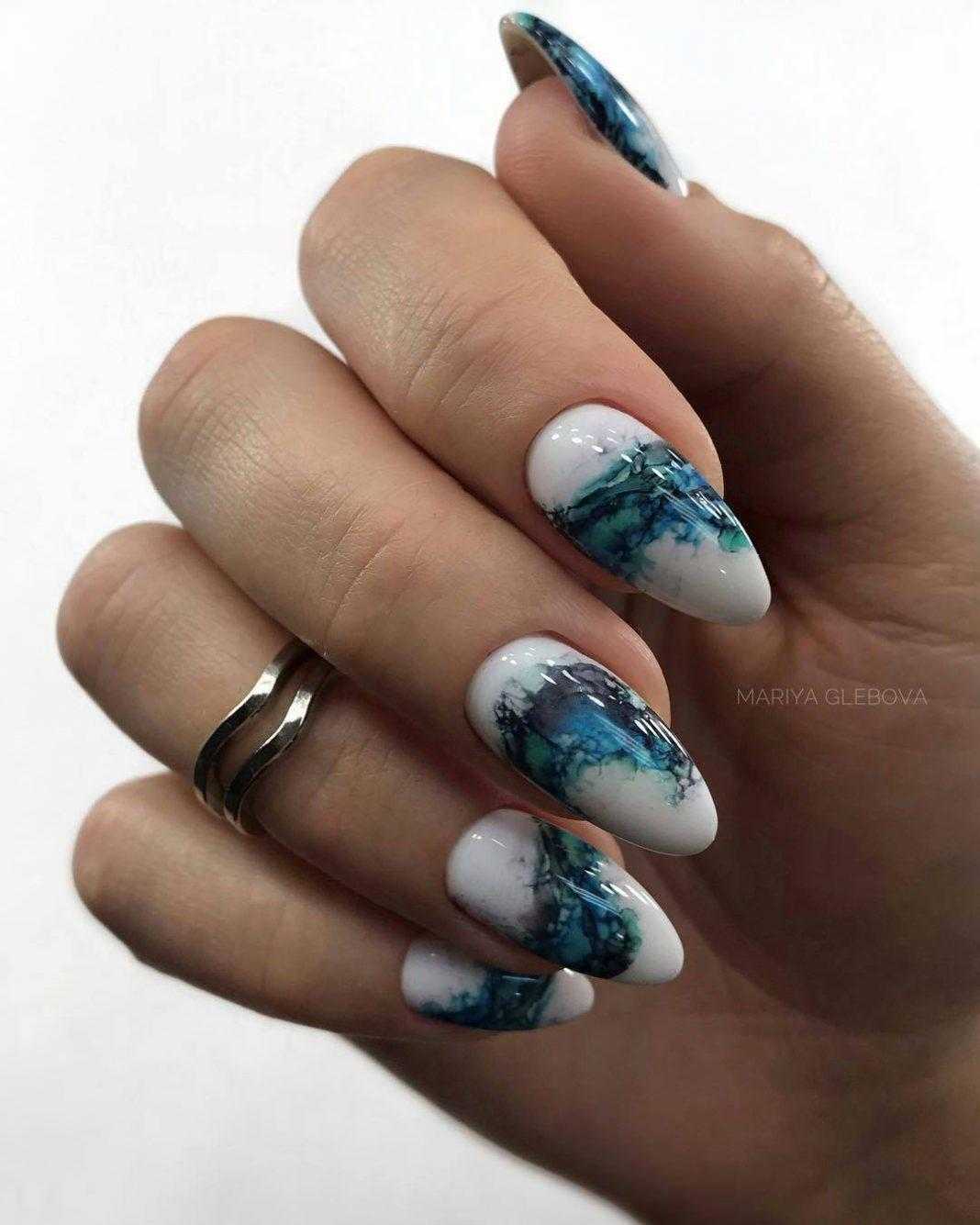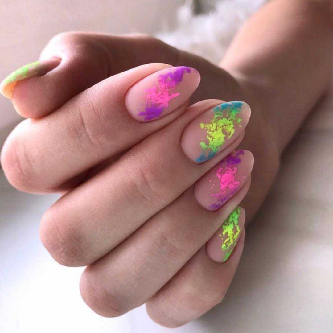 Если вы ищете идеальный нейл-арт для следующего маникюра, то акварельный эффект – это то, что вам нужно. Дизайн имитирует смешение и высыхание краски на холсте; сочетание этого и ярких цветов делает его женственным и забавным вариантом. Чтобы создать такой дизайн простым способом, вы можете выбрать наклейки для ногтей, но если вы одна из тех женщин, которые предпочитают экспериментировать со своими любимыми лаками, выберите базовое покрытие и дайте ему высохнуть. Затем добавьте слой белого лака, и когда он высохнет, вы можете использовать кисть для нанесения выбранных оттенков. Нанесите несколько капель каждого цвета на кусок фольги и нанесите кистью. После каждого оттенка окунайте кисть в ацетон, а затем в желаемый лак и повторяйте процесс с другим цветом.