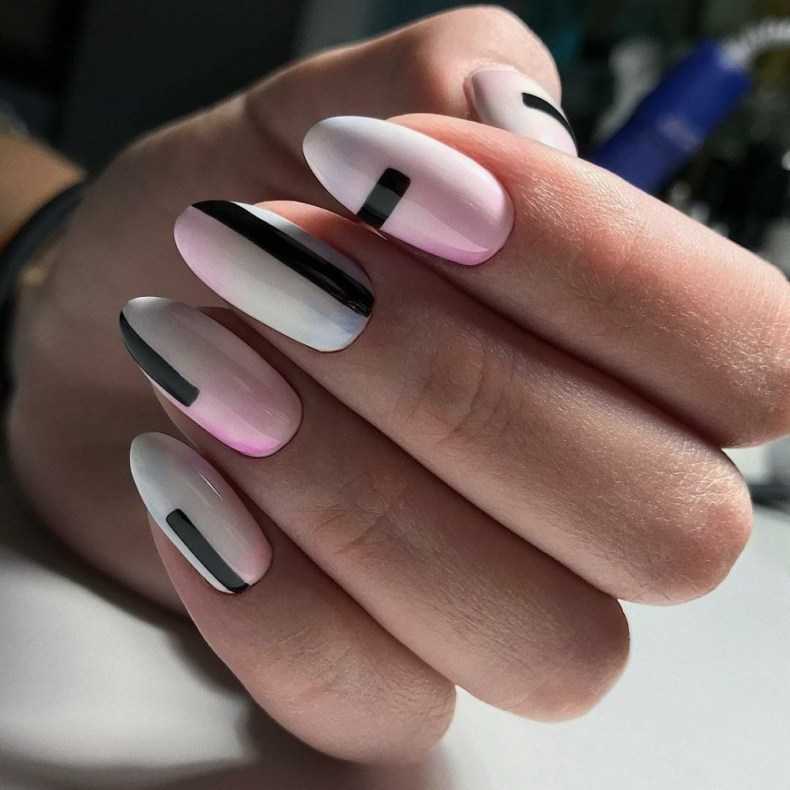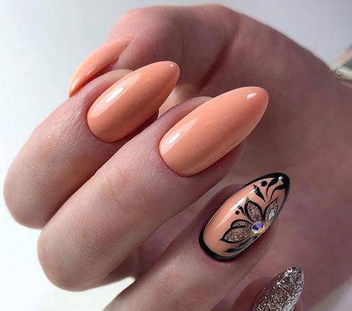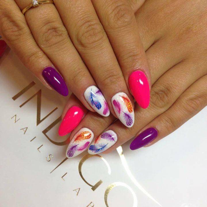 Средняя форма позволяет подобрать к ним красивый, а порой и удивительный дизайн. В частности, летним вариантом станут мазки кисти и двойная расцветка. Кстати, в последнем варианте двойной цвет лака может наноситься на один ноготь пополам, а в другом использоваться на одной руке один, на второй – другой.
