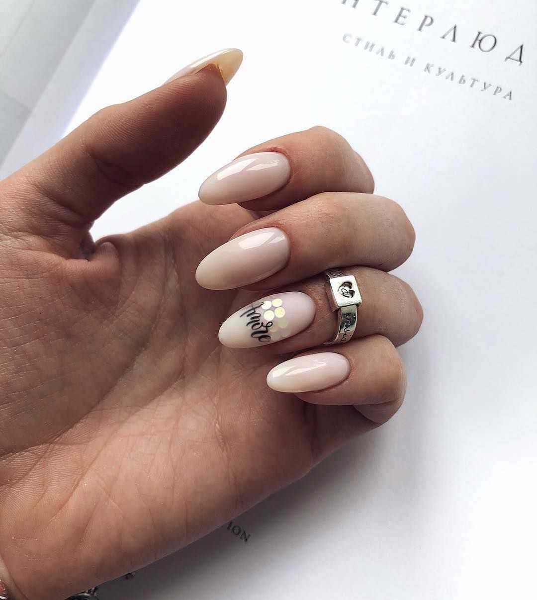 Мегатрендово будет смотреться бежевый маникюр 2023 с черной надписью. Подобный вариант дизайна станет хорошим выбором для ноготков любой длины. Надпись украсит и французский маникюр 2023.